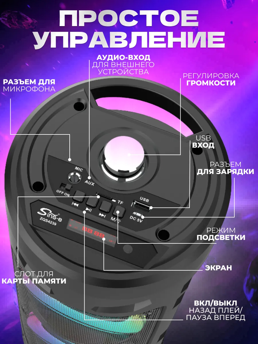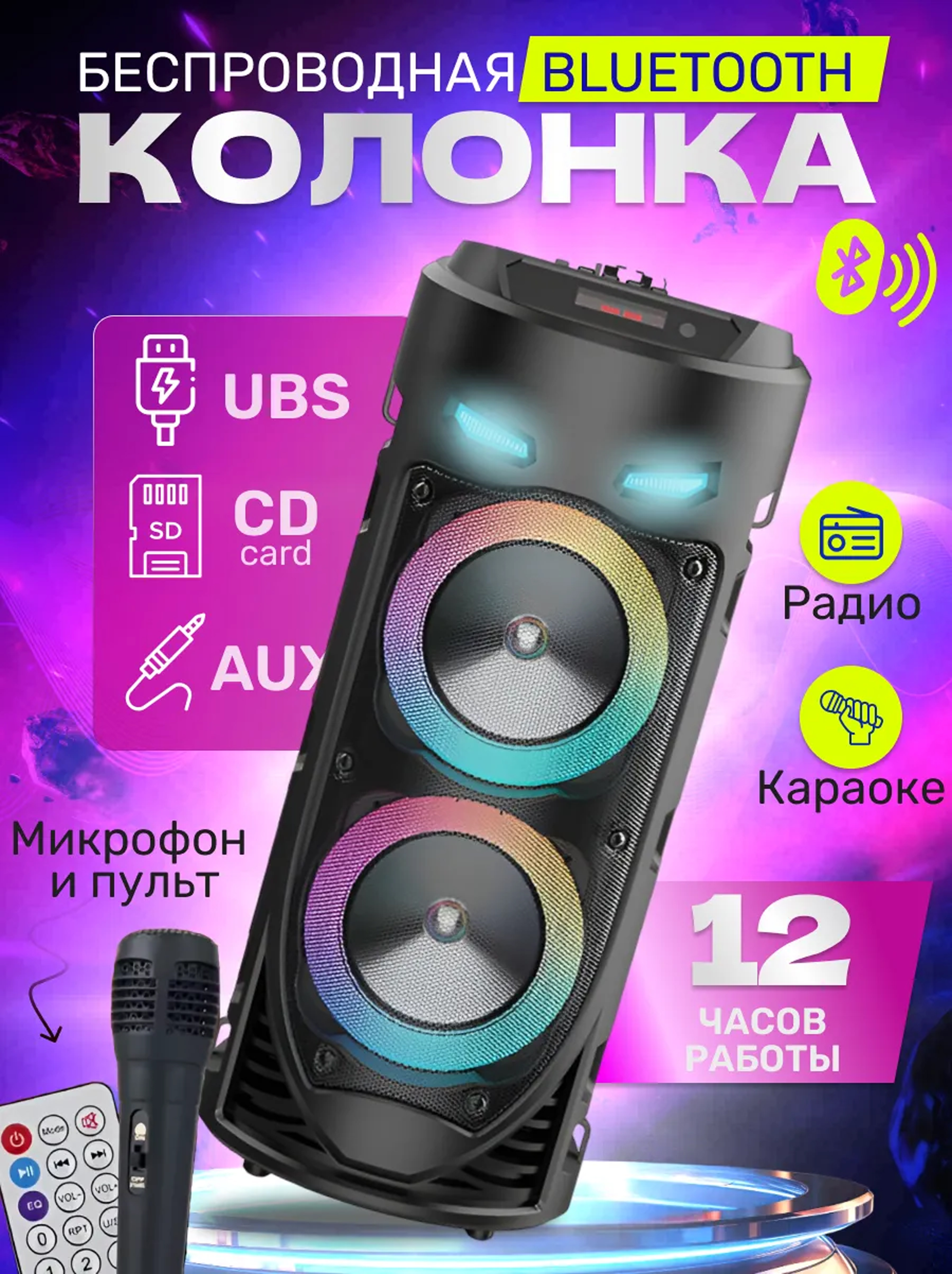 Встречайте короля вечеринок — беспроводную музыкальную колонку с микрофоном, которая станет отличным выбором для всех, кто ценит мощный бас и чистый объемный звук даже на максимальной громкости. Эта модель популярна как у подростков, так и у взрослых благодаря своему стильному и динамичному дизайну.