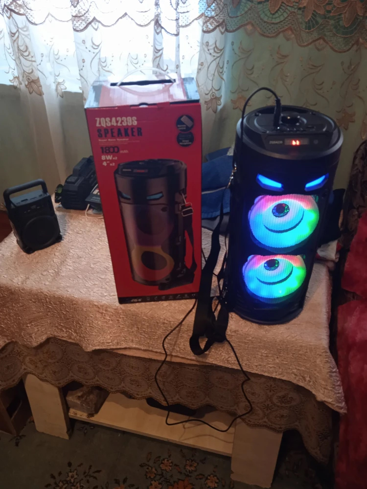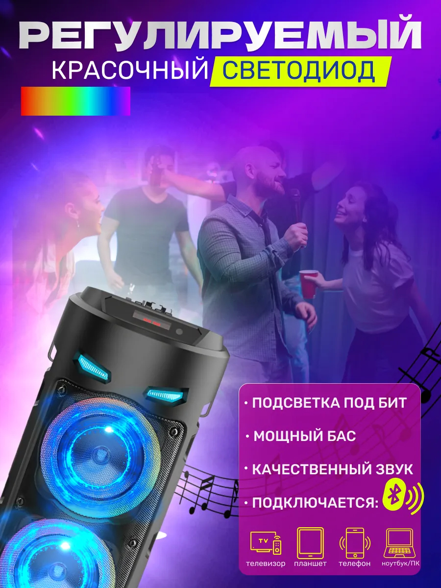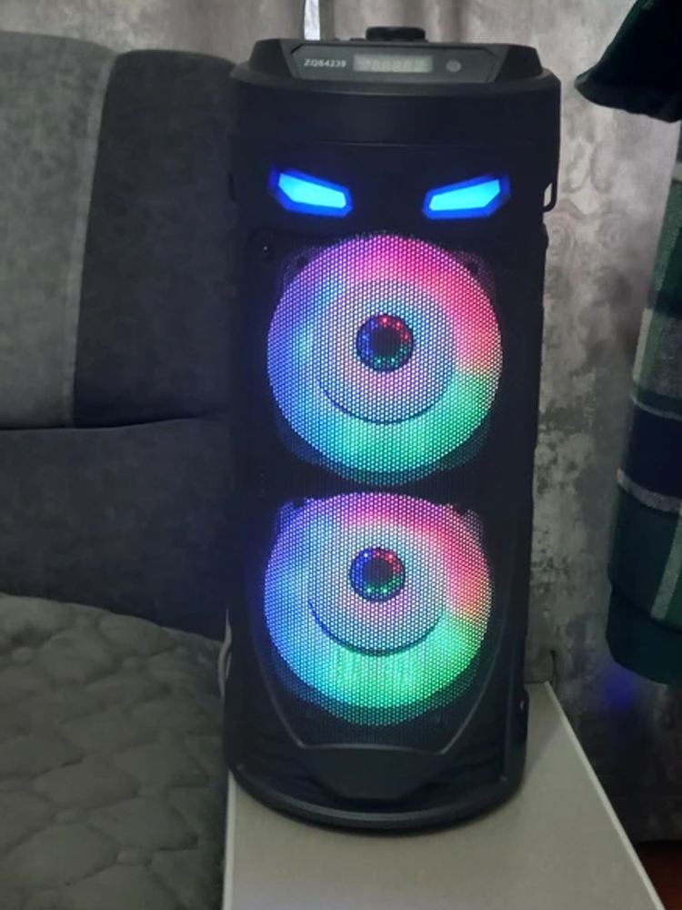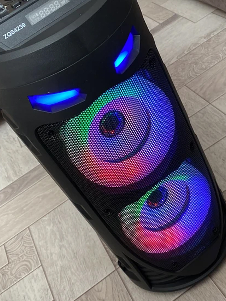 Колонка оснащена RGB подсветкой с тремя режимами, которые реагируют на биты в акустике, и технологией Bluetooth 5.0, что позволяет подключаться к телефону, компьютеру, планшету, ноутбуку и даже к телевизору (при наличии Bluetooth модуля). В комплекте идет проводной микрофон, что делает ее идеальной для караоке-вечеринок.